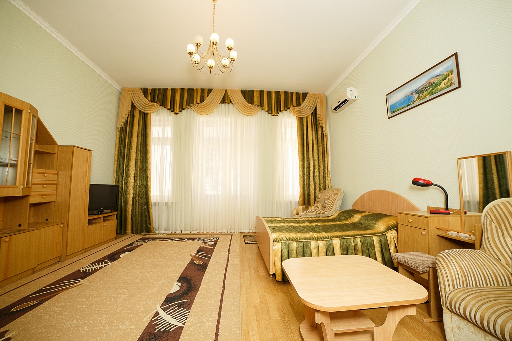 双人床,沙发,家具一套,卫生间,浴室,冰箱,电视,电话,厨具,空调,宽敞的海景阳台。每天,在“领事”餐厅注册三餐。