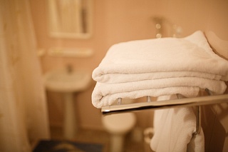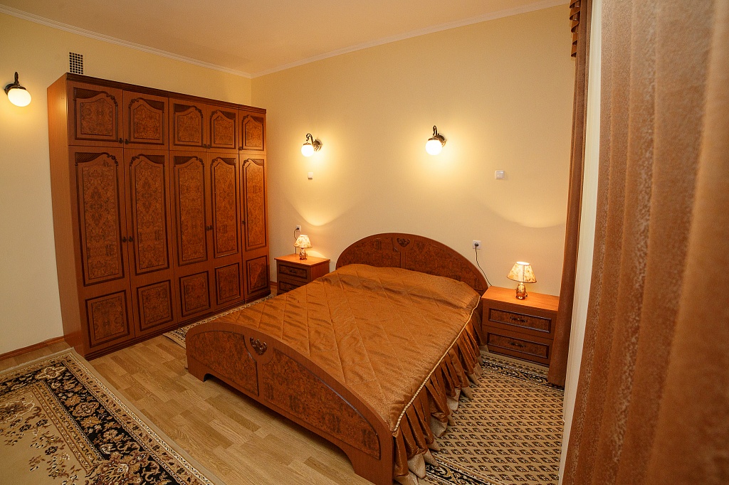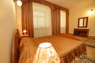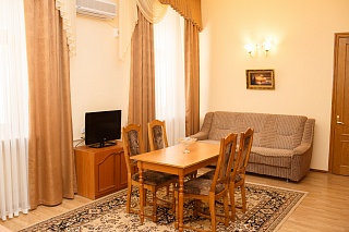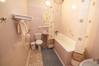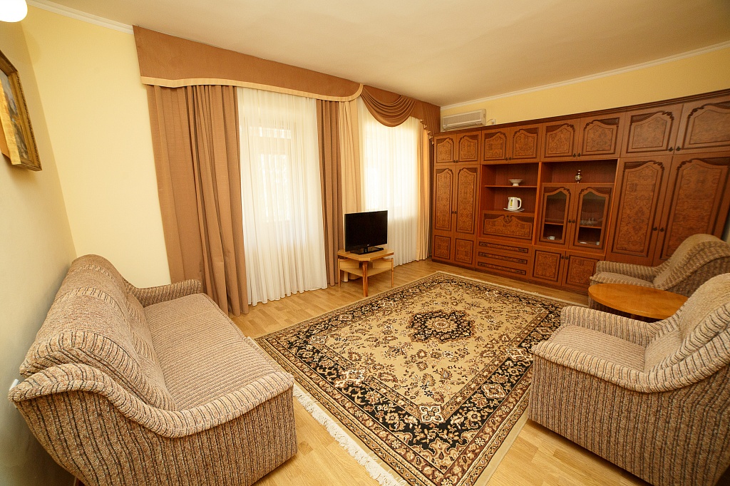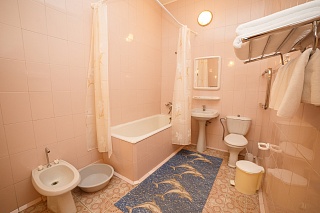The room has a double bed, a sofa, a set of furniture, a toilet, a bath, TV, air conditioning, refrigerator.