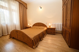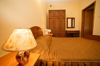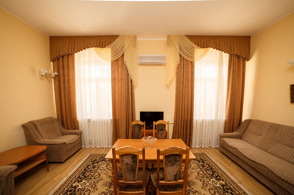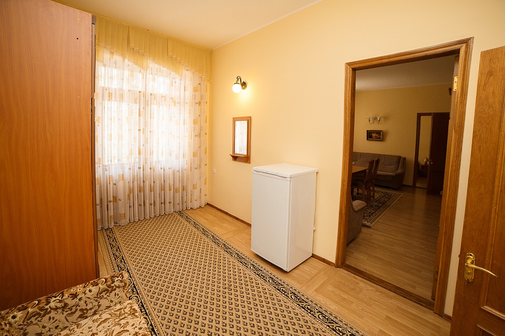 The room has two double beds, a sofa, a set of furniture, a bathroom, a bath, TV, air conditioning, refrigerator.